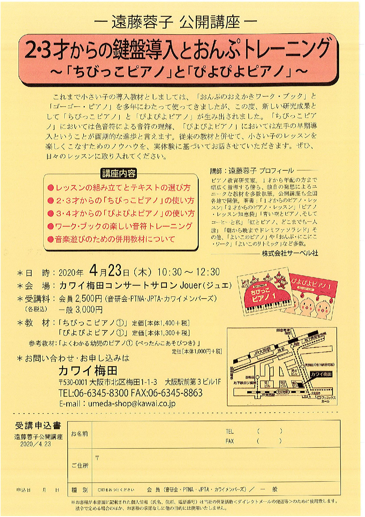 これまで小さい子の導入教材としましては、「おんぷのおえかきワーク・ブック」と「ゴーゴー・ピアノ」を多年にわたって使ってきましたが、この度、新しい研究成果として「ちびっこピアノ」と「ぴよぴよピアノ」が生み出されました。「ちびっこピアノ」においては色音符により音符の理解、「ぴよぴよピアノ」においては左手の早期導入ということが画期的な進歩といえます。従来の教材と併せて、小さい子のレッスンを楽しくこなすためのノウハウを、実体験に基づいてお話させていただきます。ぜひ、日々のレッスンに取り入れてください。