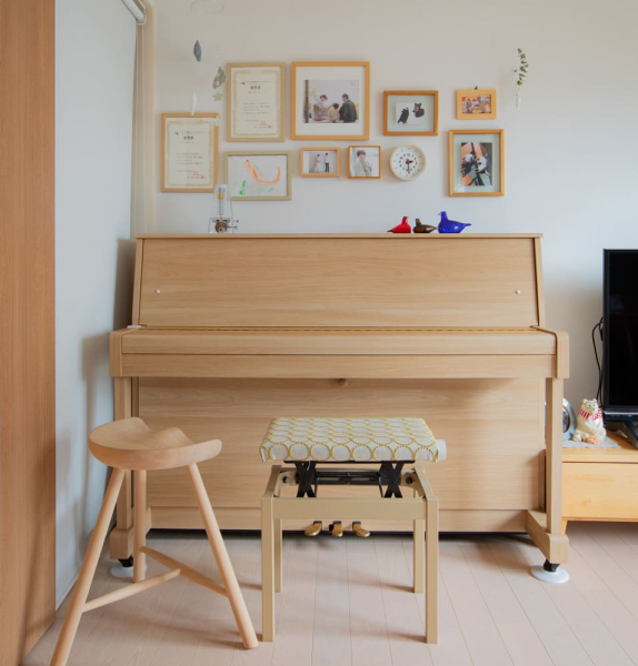 カワイとしては、用途はさておき、”自分らしさ、インテリアとの親和性や彩り”をコンセプトに考えていました。お客様の声を聞く中で、アップライトピアノ「NF-15」をお買い求めいただいた方の多くが「黒艶のピアノしかないと思っていたけど、インテリアにも合わせられるピアノを見つけた!」と喜びを感じてくださっている事がわかったんです。ただ、椅子は選べないので、独自で座部を張り替えて楽しんでいらっしゃる方がいたんです(下図)。