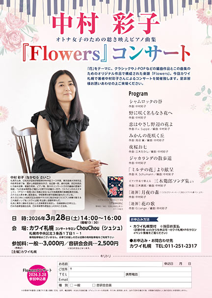 「花」をテーマに、クラシックやJ-POP などの編曲作品とこの曲集のためのオリジナル作品で構成された楽譜「Flowers」。 今回カワイ札幌で著者中村彩子さんによるコンサートを開催致します。 是非、皆様お誘いあわせの上ご来場ください。 |