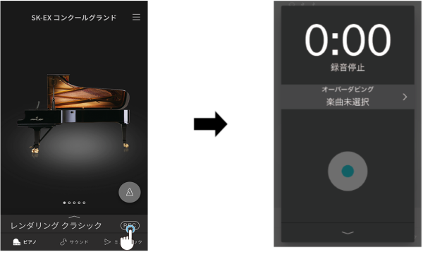 オーバーダビングのためにレコーダー画面を表示するには、ピアノタブ画面、サウンドタブ画面でRECボタンをダブルタップします。
